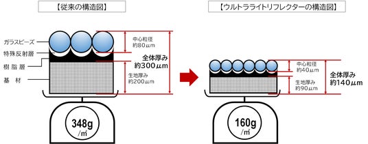2022年9月に発売した「Ref Lite ウルトラライトリフレクター」は、半導体向けの精緻な製造技術を有する当社と、超軽量糸の製造技術を誇るカジレーネ株式会社(本社:石川県かほく市 代表取締役社長 梶 政隆)の技術を合わせて共同開発した、極薄軽量クロスです。従来のものと比較して体積比25%で製造が難しいとされていた40μmのガラスビーズと、極細で超軽量糸を採用したことで、0.09mmの極薄かつ世界最軽量のリフレクターが誕生しました。
