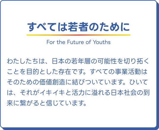 若い世代の探究心に火をつけ「今の教育のあり方をアップデートする」をミッションに、子どもたちの自己実現、日本社会を支える人材育成の事業に取り組んでいます。
