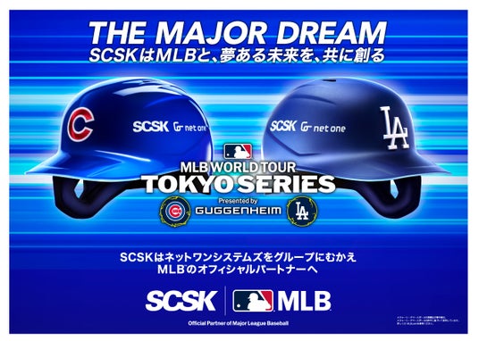 今回の契約では、「MLB TOKYO SERIES presented by Guggenheim」でChicago CubsとLos Angeles Dodgersの両チームが着用するMLBの公式ヘルメットに、SCSKならびに経営統合を前提として完全子会社としたネットワンシステムズ株式会社(以下、ネットワンシステムズ)のロゴマーク掲出を伴うものであり、「THE MAJOR DREAM」をキーメッセージにプロモーションを展開してまいります。