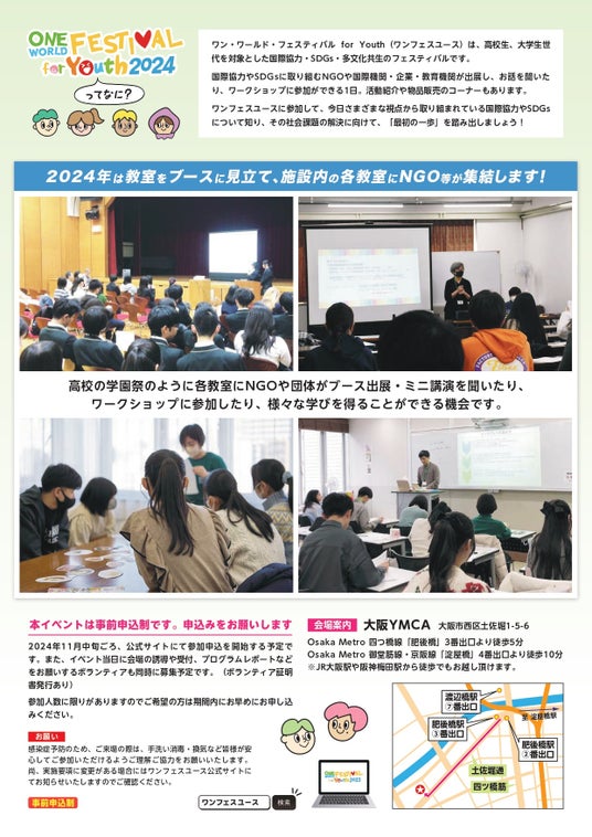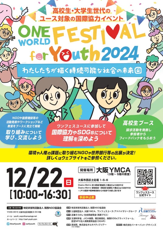 特定非営利活動法人関西NGO協議会(本部:大阪市北区 代表:三輪敦子)は、SDGsに関連するNGO等の活動や高校生の探究学習の発表を聞くことができるイベント「ワン・ワールド・フェスティバル for Youth 2024」を12月22日(日)に開催。同イベントの参加者募集を11月27日(水)から開始いたします。