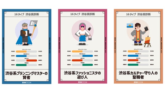 一般社団法人渋谷未来デザイン(代表理事:小泉秀樹、以下渋谷未来デザイン)が、10月18日(金)~11月10日(日)に開催するソーシャル&カルチャーデザインの祭典「SOCIAL INNOVATION WEEK 2024(以下SIW)」にて10月25日(金)より、SIW参加者を含め多くの方々に楽しんでいただけるコンテンツとして「渋谷系16タイプ診断」を提供しました。