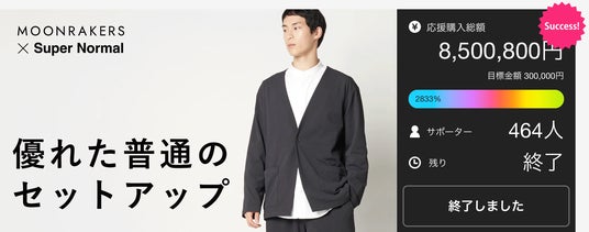 株式会社Super Normal(代表取締役:奥谷孝司/以下Super Normal)がMOONRAKERS(ムーンレイカーズ / 運営:MOONRAKERS TECHNOLOGIES株式会社 代表取締役:西田 誠、以下MOONRAKERS)と取り組んだ第一弾プロダクトして実施したクラウドファンディング『MOONRAKERS × Super Normal「優れた普通のセットアップ」』が、目標金額の2833%となる850万円を超える応援購入で終了しました。