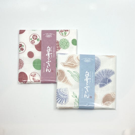 白雪友禅ふきん「四季の花/貝みやげ」各660円蔦屋重三郎がプロデュースした「青楼美人合姿鏡」「潮干のつと」の作品イメージから、季節の花や貝をモチーフに普段使いしやすい絵柄にデザイン。