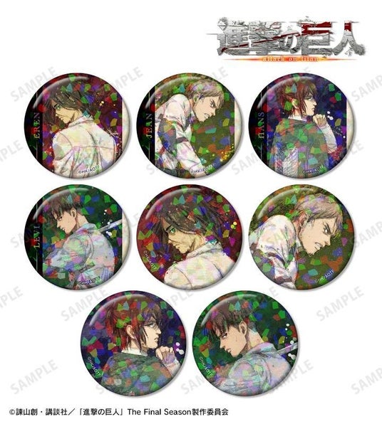 エレン、ジャン、ハンジ、リヴァイの描き下ろしイラストを新たなタッチで魅力的に表現し、ホログラム加工を施した缶バッジに仕上げました。