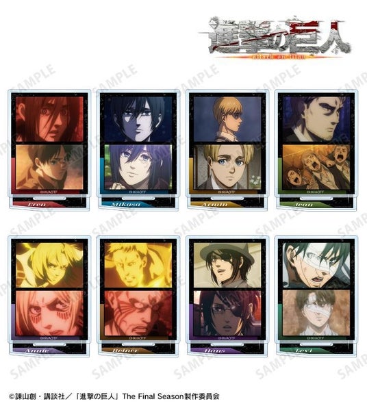 エレン、ミカサ、アルミン、ジャン、アニ、ライナー、ハンジ、リヴァイの印象的なシーンをアクリルスタンドに仕上げました。