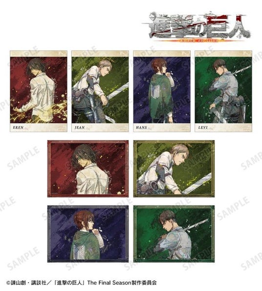エレン、ジャン、ハンジ、リヴァイの描き下ろしイラストを新たなタッチで魅力的に表現し、ブロマイドに仕上げました。