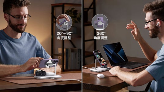 充電スタンドは2つのコイルを内蔵しているので、縦向き、横向きどちらでもOK。動画を鑑賞しながら充電もできます。前後方向には20°~90°の傾き調整、正面向きは360°の回転に対応するので、日常生活からビジネスシーンまで様々な場面で役立ちます。