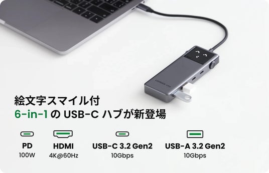 絵文字ロボットフェイス表示で、機器の接続状態や充電状態がわかる6-in-1 USB-Cハブ、日本国内の主要な家電量販店およびフォーカルポイント・ダイレクトで取扱開始