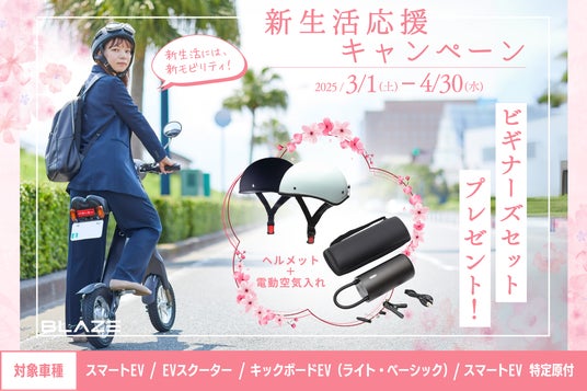 株式会社ブレイズ(愛知県名古屋市、代表取締役:市川秀幸、以下ブレイズ)は、2025年3月1日(土)~4月30日(水)の期間、ブレイズの電動バイク&電動キックボードを対象とした「新生活応援キャンペーン」を実施いたします。