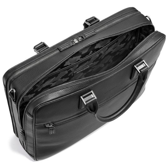 13.3インチのノートPC、B4ファイルが収納できるサイズです。外装はシックで洗練されたシュリンクレザー、ファスナーを開くとビジネスシーンでもしっくりくるブラックを基調としたカモフラ柄がアクセントになっています。